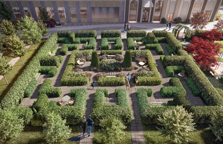 В проекте выполнено авторское благоустройство в стиле Английского парка с зеленым лабиринтом, яблоневым и розовым садами.